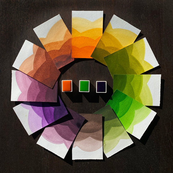 All our sets come with a colour wheel card for use as a guide for mixing. We will gladly send extra colour wheel cards with any order. If you are ordering half pans separately, have lost the card that came with your set, or for any other reason would like to receive a colour wheel card without purchasing the set...please include a note with your order letting us know which cards you'd like.